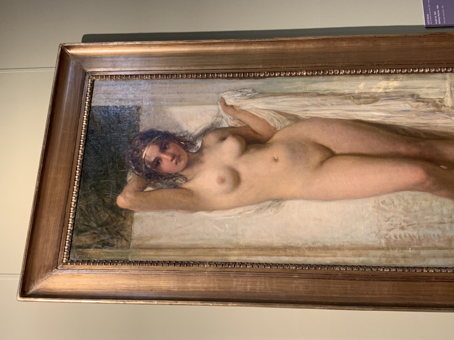 - "The painting features a nude woman with curly hair, adorned with a gold headpiece and earrings" by FM-N643B3, licensed under CC BY 4.0