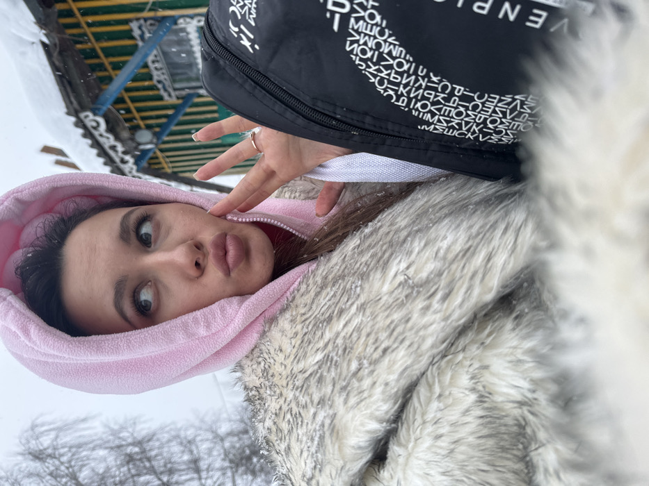 A female individual is depicted outdoors in a snowy environment in Красный Маяк, Russia