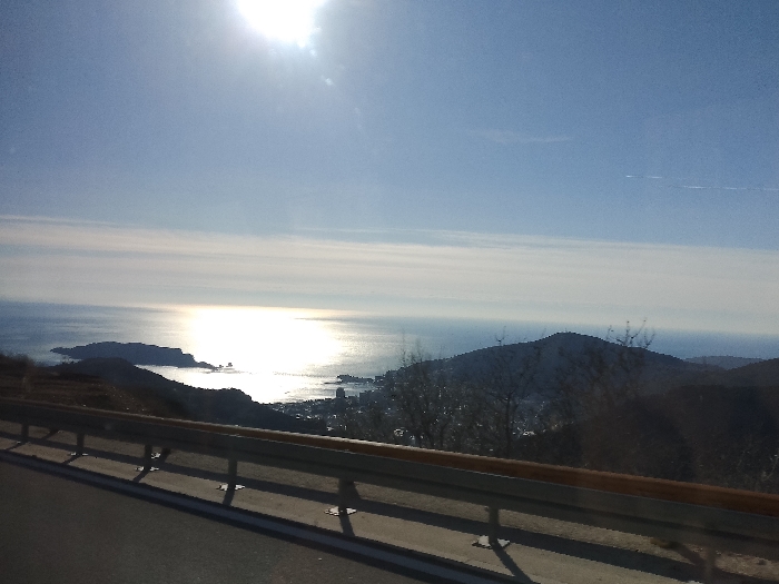 The image displays an elevated, panoramic view from Lapčići, Montenegro, overlooking a coastal scene. The foreground consists of an asphalt road surface and a multi-sectioned metal guardrail with a wooden top rail, running horizontally across the lower third of the frame. Shadows from the guardrail posts are cast upon the road surface. Beyond the guardrail, sloped terrain with sparse, bare-branched vegetation descends towards the Adriatic Sea. The sea occupies the central portion of the image, marked by a broad, intense reflection of sunlight emanating from the upper-left quadrant. A distinct island or prominent landmass is observed in the sea to the left of the sun's reflection. Further along the coastline, to the right and beneath the sun glare, a cluster of buildings indicative of a coastal settlement is visible. Darker, mountainous land masses rise on the right side of the frame, partially obscuring the distant town. The sky above is light blue, featuring a bright, glaring sun in the upper-left and faint, horizontal atmospheric streaking or cloud formations. A thin, white aircraft contrail is present in the upper-right.