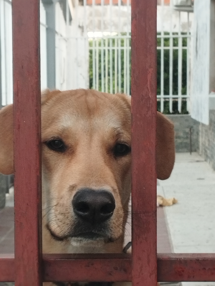 - "The scene captures a light brown, short-haired dog peering directly through rusty red vertical metal gate bars in Guacara, Venezuela" by FM-uiwdr1, licensed under CC BY 4.0
