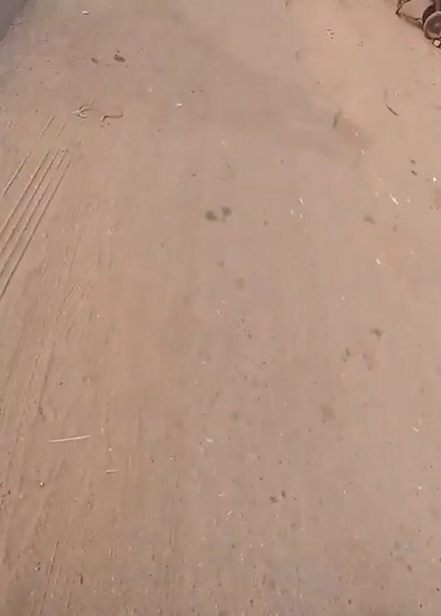 single-story building, likely a store, from a low angle. The building has a reddish-brown roof and a wooden structure in front, possibly used for displaying merchandise. Various items, including white containers, pipes, and what appear to be sacks, are visible inside the wooden structure. A sign on the building reads "NEALAF WHOLESALE" or similar words. The ground in front of the building is dirt or sand-colored. A few trees are visible in the background. The sky is light blue. The camera moves slightly, causing the image to shift. A shadow of a person can be seen on the ground at the beginning of the video, suggesting the person is holding the camera.