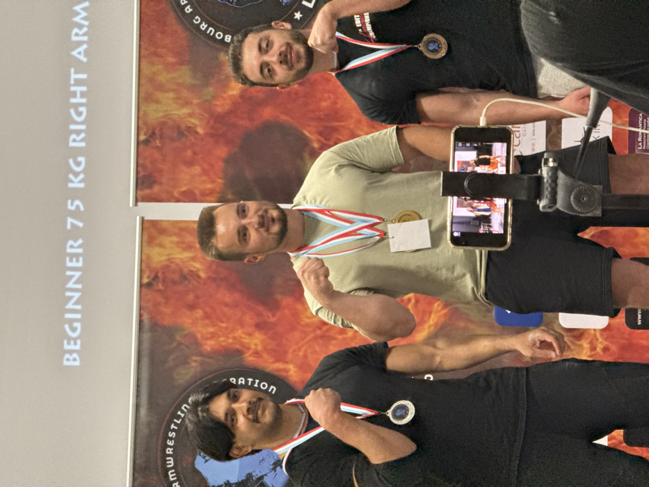 Three men stand in front of a banner that reads "BEGINNER 75 KG RIGHT ARM". They are wearing medals with ribbons in the French national colors. The man in the middle is holding a phone mounted on a tripod. The background is a fiery orange color. The men are all smiling and look proud. There is text on the banner that includes the words "ARMRESTLING" and "BOURG AR".