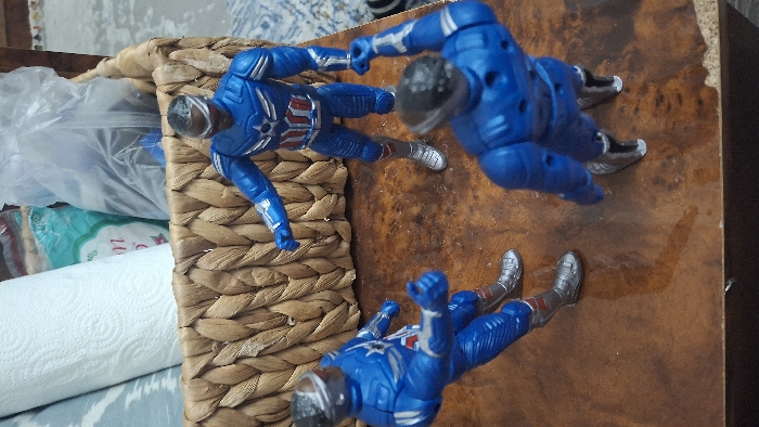 Three Captain America action figures rest on a wooden surface and inside a wicker basket. The figures are dressed in blue, white, and red uniforms, with gray boots. A roll of white paper towels sits beside the basket, partially obscured by plastic packaging. A marble-patterned surface is in the background.