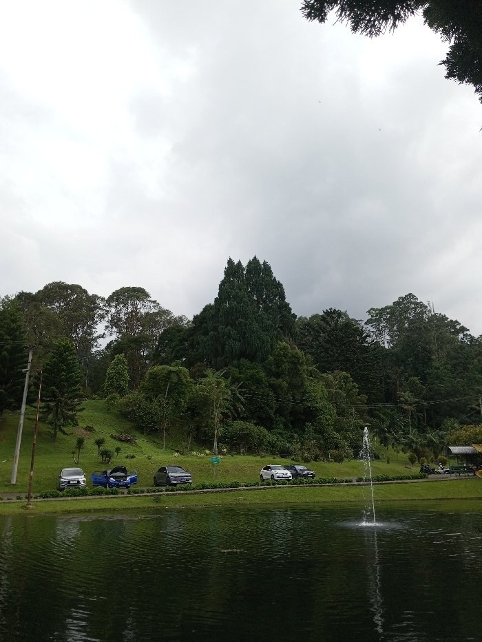 This image captures a park landscape in Ambositra, Madagascar, under a heavily overcast, light grey sky. The foreground is dominated by a dark body of water, consistent with a lake or large pond, featuring a single, active water fountain jet rising near its center-right, with its reflection visible below. A paved road or path runs horizontally behind the water, bordered by a strip of maintained green grass. Along this path, six vehicles are parked: a silver SUV, a blue sedan with its hood open, a dark grey sedan, a white SUV, and two additional dark-colored vehicles positioned further right. A dark utility pole stands on the far left edge of the road. The midground and background consist of a densely forested hillside, showcasing various shades of green foliage and numerous trees. A prominent cluster of tall, slender evergreen trees forms a distinct peak near the center of the hill's crest. Towards the far right, partially obscured by trees, a small shelter-like structure and additional parked motorcycles are visible. No individuals are discernibly present in the scene.
