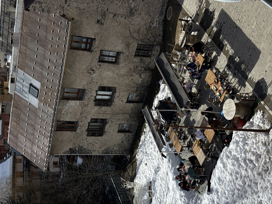 This image depicts an outdoor patio area adjacent to a multi-story stone building in La Salle-les-Alpes, France. The building features a rough, light-brown stone facade with several windows, some on the lower levels equipped with closed dark wooden shutters. The upper windows lack shutters. The roof is corrugated metal, predominantly a weathered brown, with a distinct, newer-looking silver corrugated section and a single skylight. A white rain gutter and downspout are visible on the left side of the building. The outdoor patio is partially covered in snow on the left and a paved with light-colored bricks on the right. Approximately 18 to 20 individuals are seated at various rectangular and round wooden tables. Some tables are positioned under dark, retractable awnings supported by metal frames. People are observed eating, drinking, and socializing. Specific objects include a central brown pole with a light fixture. On the snow-covered ground to the far left, a large, white, illuminated decorative deer figure is present. On the paved section, two wooden barrels are visible, one serving as a table base and another as a decorative element next to a gray planter. A red pot or planter is near the base of the central pole. Bare trees with no leaves are visible in the background on the left and close to the building's facade. The scene is under natural daylight, casting clear shadows from the awnings, tables, and structures onto the paved ground. Further buildings are visible in the distant background.