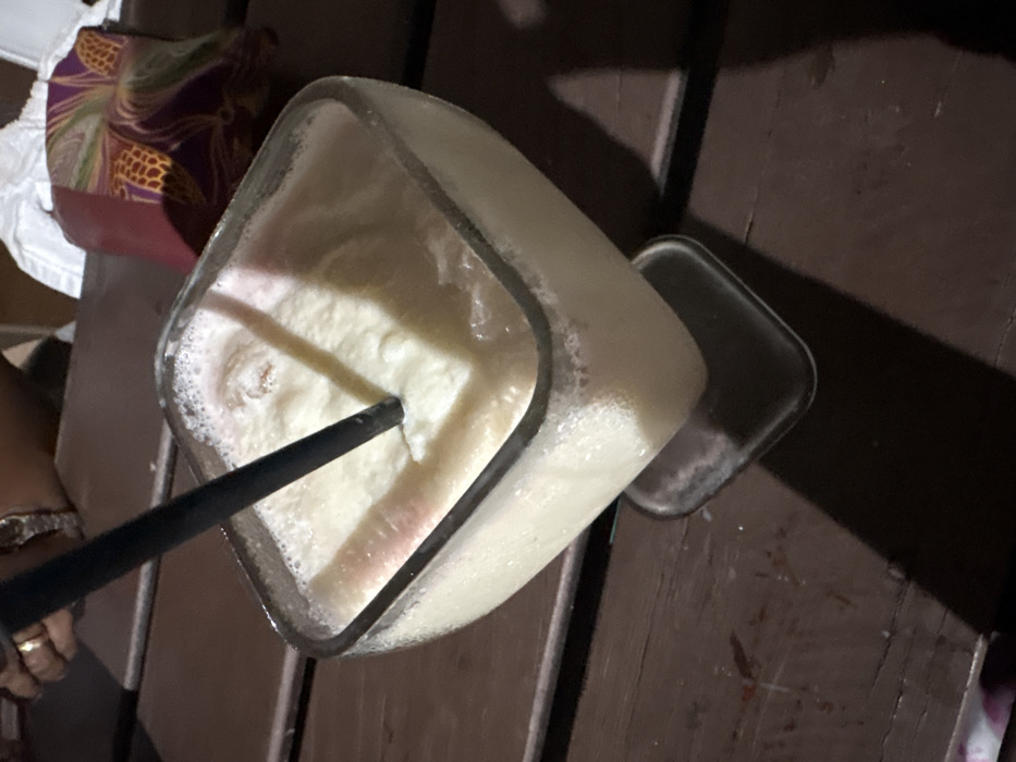 A high-angle photograph depicts a clear, stemmed glass filled with a frothy, opaque, off-white beverage exhibiting subtle pinkish coloration. A black plastic straw is inserted into the drink, angled towards the upper left. Condensation is visible on the exterior of the glass. The glass is positioned on a dark brown, horizontally-slatted wooden table surface. In the upper left background, a human hand is visible, wearing a gold ring on the fourth finger and a metallic wristwatch, resting on the table. In the upper right background, a reddish-purple object patterned with repeating gold pineapple motifs is partially visible, adjacent to a crumpled white fabric. The scene is dimly lit, suggesting an evening or indoor setting. This environment is consistent with a casual dining establishment or bar, a type of venue found in the city of Roatán, Honduras; however, specific geographical identifiers within Roatán are not present in the image.