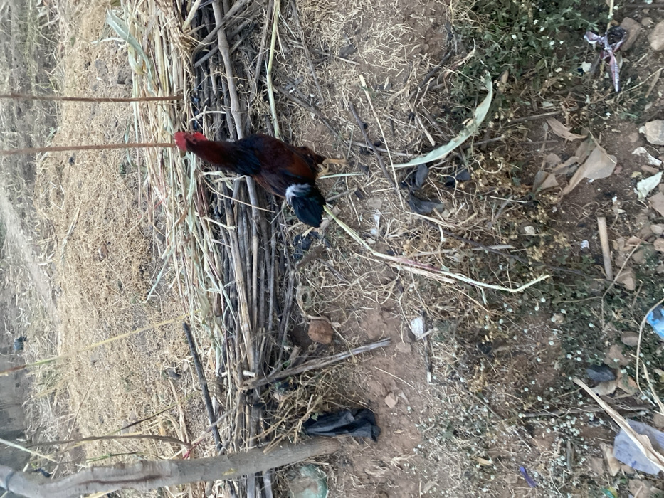 The image displays an outdoor scene in Sabon Gari Nassarawa, Nigeria. A single rooster stands in the lower-right portion of the frame, positioned on dry, uneven ground. The rooster exhibits a dark brown and black body, a vibrant red comb and wattle, and a tail with iridescent green-blue and white feathers. Its legs are yellow. The ground consists primarily of reddish-brown soil, dry grass, and sparse green vegetation. A horizontal accumulation of dry sticks and plant stalks is present in the mid-ground, extending across the frame. To the left, a portion of a tree trunk or thick branch is visible. Various pieces of debris, including crumpled black plastic bags and other refuse, are scattered across the foreground and mid-ground. The background shows additional dry ground and two slender, upright wooden poles.