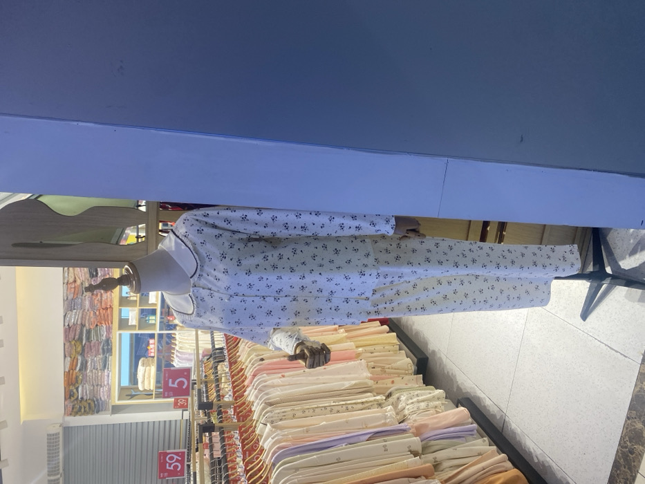 This image depicts the interior of a retail clothing store, likely situated within the Baiyun District, China. The central subject is a headless mannequin, featuring a wooden-toned neck and hands, positioned on a black metal stand. The mannequin is dressed in a two-piece white pajama set adorned with small, repetitive dark floral or leaf patterns. The top is long-sleeved with a button-front closure and a distinct white Peter Pan collar outlined with a thin black trim. The mannequin's visible right hand is articulated in a "thumbs up" gesture. To the left and extending into the background, numerous clothing items, primarily light-colored pajamas or loungewear in pastel shades (creams, yellows, pinks, light blues), are neatly displayed on metal racks with individual hangers. Further back, additional folded garments are visible on shelves. Two red rectangular signs with white text are partially visible above the clothing racks, displaying "59" and "5.", likely indicating pricing or promotional information. The floor consists of light-colored square tiles with darker grout lines. The environment is brightly illuminated by overhead lighting. A large, flat, blue-tinted vertical surface occupies the right side of the frame, suggesting a wall, pillar, or reflective panel.
