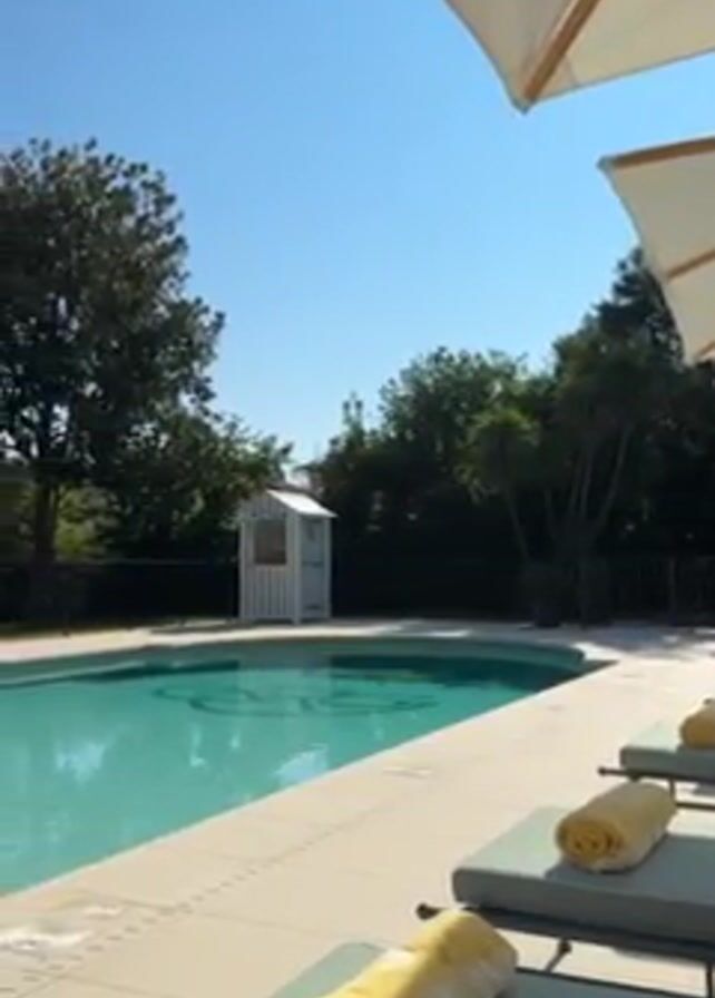 swimming pool surrounded by lounge chairs under white umbrellas. Some of the lounge chairs have rolled-up yellow and white towels on them. Lush green trees and hedges surround the pool area. A small white lifeguard-style building stands near the pool. The pool itself is a light blue color with a large logo or design on the bottom. The sky is clear and blue. The camera pans around the pool area, revealing more lounge chairs, umbrellas, a tall palm tree, and a yellow building with a red-tiled roof.