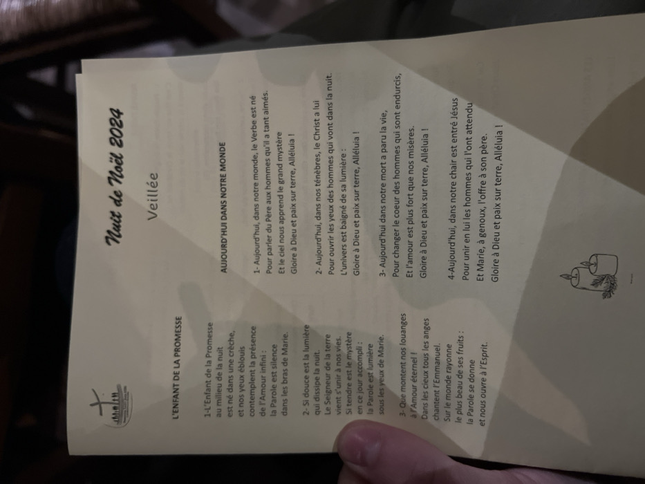 A human left hand, with light skin tone, holds a white or off-white folded paper document vertically by its lower-left corner. The document displays French text and illustrations, illuminated against a dark, out-of-focus background, suggesting an indoor setting. The top of the document features the title "Nuit de Noël 2024" (Christmas Night 2024) in a decorative script, centered above "Veillée" (Vigil). In the top-left corner, a logo depicts a stylized cross above a group of figures, with the text "Paroisses du pôle de Cherbourg-en-Cotentin," indicating the document's origin within the parishes of Cherbourg-en-Cotentin, France. The main body of the document is divided into two columns of text. The left column is titled "L'ENFANT DE LA PROMESSE" (THE CHILD OF THE PROMISE) and contains numbered stanzas (1-3 partially visible) of what appear to be religious verses or hymns. The right column is titled "AUJOURD'HUI DANS NOTRE MONDE" (TODAY IN OUR WORLD) and similarly presents numbered stanzas (1-4 fully visible) of religious text, frequently ending with "Gloire à Dieu et paix sur terre, Alléluia !" (Glory to God and peace on earth, Alleluia!). At the bottom center of the document, a small line-art illustration depicts two lit candles surrounded by pine needles. A vertical crease is present down the center of the document, indicating it is a folded leaflet or program.