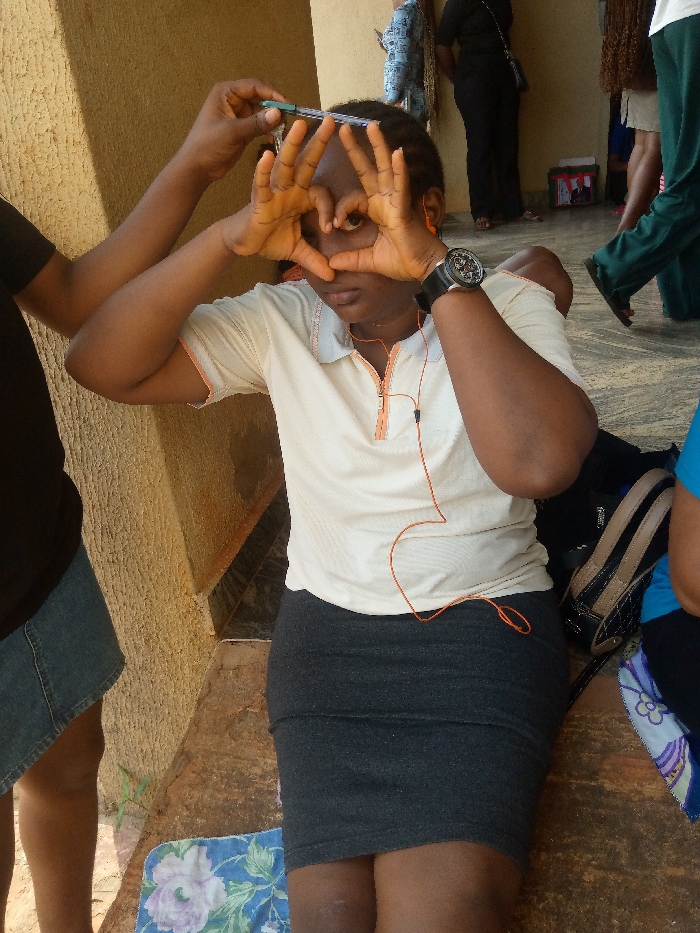 The scene takes place on a concrete surface, likely a veranda or covered outdoor area, in Nsugbe, Nigeria. A young woman is seated, wearing a light-colored short-sleeved polo shirt with an orange-lined collar, a dark gray fitted skirt, and a black wristwatch on her left wrist. She has orange earphones plugged into her ears, with the cord visible over her chest. Her hands are positioned in front of her face, forming a heart or triangular shape, through which she looks directly forward. To her left, the arms of another individual are visible, holding a green pen horizontally above the seated woman's head. On the ground near the woman's knees, a blue cloth with a white floral pattern is visible. To her right, a dark bag and a pair of black and beige flat shoes are resting on the ground. The background is out of focus, showing several other individuals and a green box that appears to contain a political poster featuring a man's face.