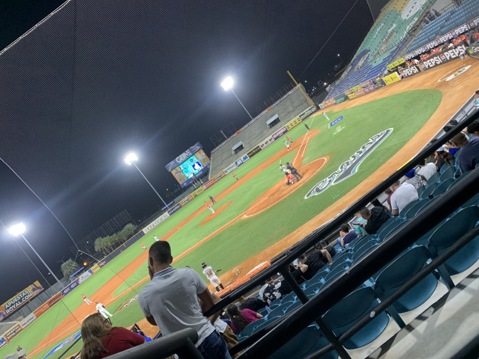 The image depicts a baseball game at night. Floodlights illuminate the field, with players in action around the pitcher's mound and bases. Spectators sit in tiered seating, divided by railings. Advertising banners line the outfield fence, featuring brands like Pepsi and "APUESTAS ROYAL.COM". A large scoreboard displays information above the stands. A man in a grey shirt and jeans stands at the railing, facing the field, while a woman in red sits beside him.