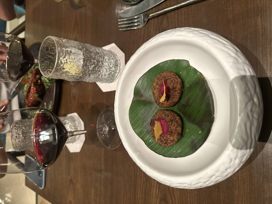 A plate with two small, dark-colored patties served on a green leaf is the focal point