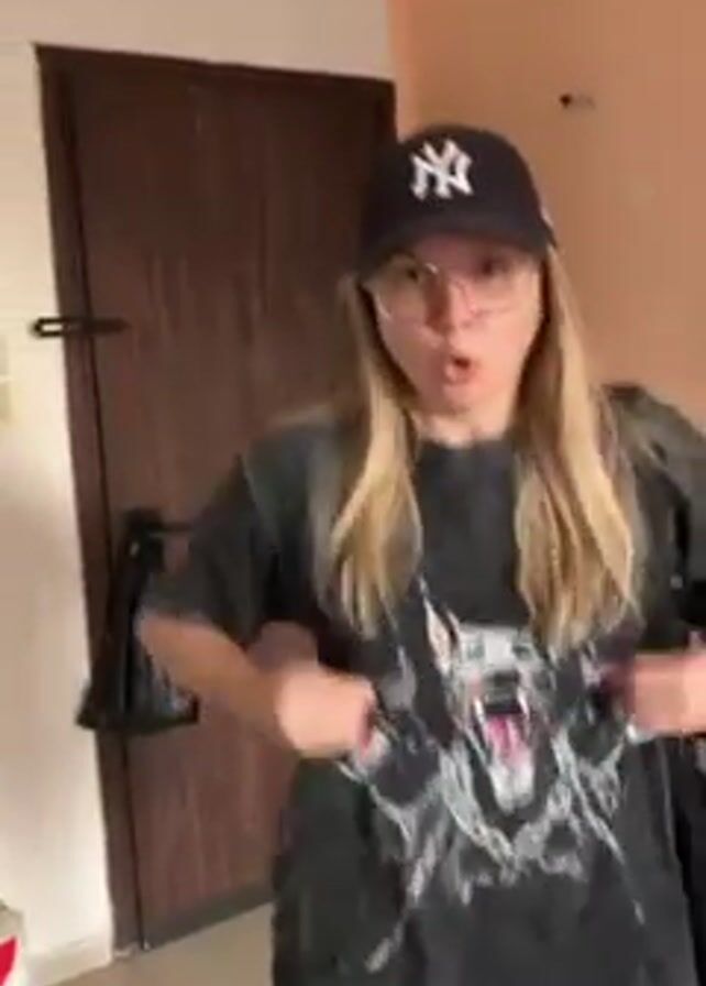 woman standing in a room. She is wearing a gray graphic tee, a black baseball cap with a "NY" logo, and glasses. She is making a "howling" sound and gestures with her hands as if mimicking a wolf. In the background, there is a dark-colored door, a coat rack, and peach-colored walls.