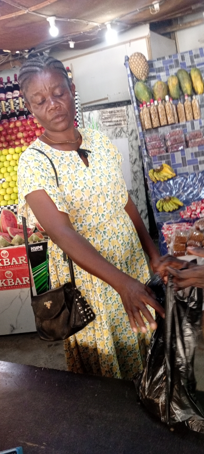 The image captures an indoor market stall scene in Aviation Quarters, Nigeria