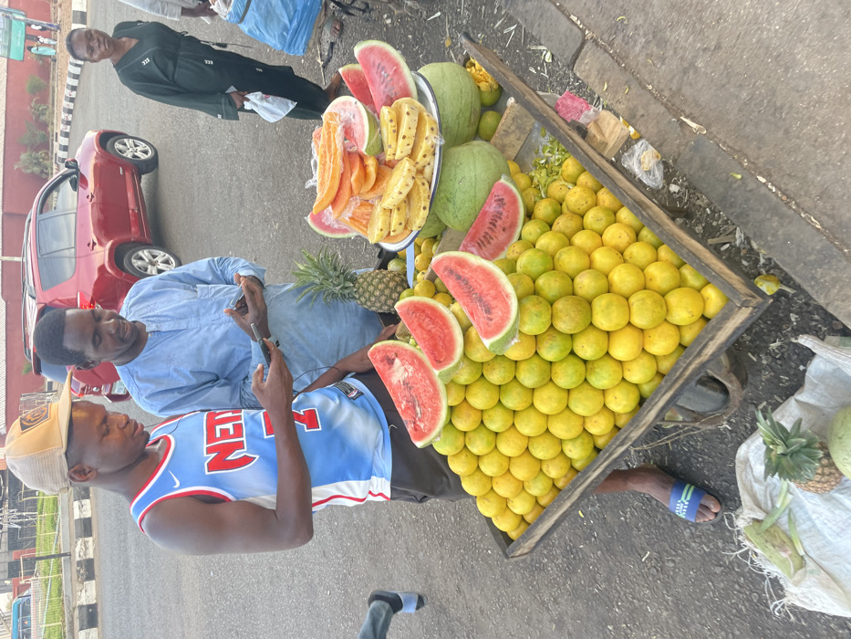 This image depicts an outdoor fruit stall operating on an asphalt road or paved area in the city of Jos, Nigeria