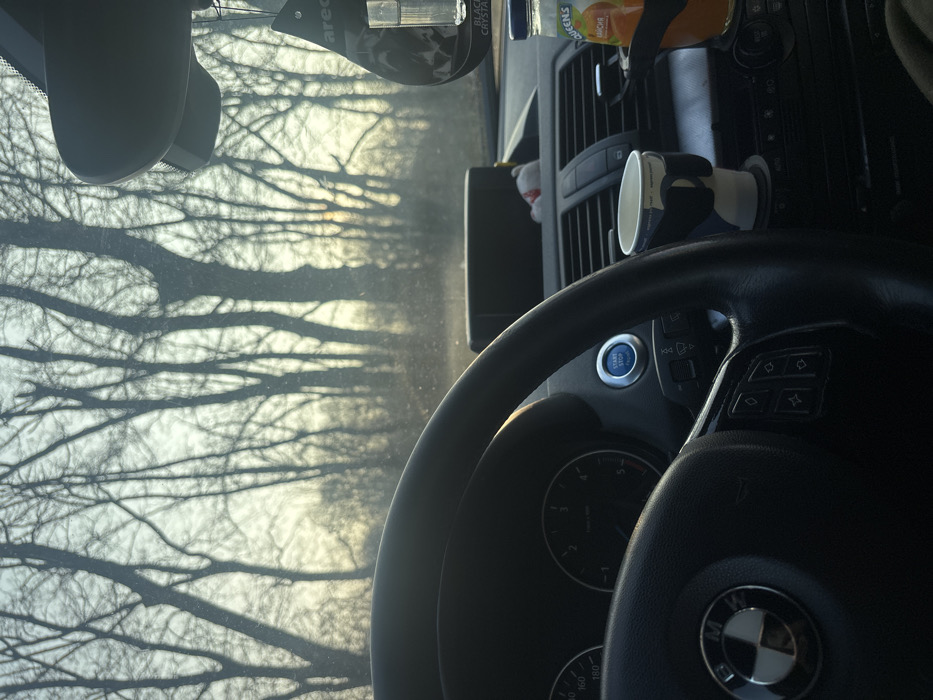 The image presents a view from inside a BMW vehicle, looking forward through a dusty windshield towards an exterior scene in Plovdiv, Bulgaria. In the foreground, the black leather steering wheel with a central BMW logo and integrated control buttons is prominent on the left, partially obscuring the vehicle's instrument cluster. To the right of the steering column, a blue-illuminated "START/STOP" engine button is visible on the dashboard. Further right, a white disposable coffee cup with a blue pattern is secured in a cup holder, positioned near central air vents. Adjacent to this, a plastic bottle containing an orange liquid, labeled "Queens" with Cyrillic text (likely "Манго"), is held in another dashboard mount. A small, light-colored plush toy is situated on the dashboard beneath a black display unit. Hanging from the rearview mirror assembly on the upper right is an "areon BLACK CRYSTAL" air freshener, featuring a clear liquid vial. The background outside the vehicle reveals a dense line of bare deciduous trees, silhouetted against a hazy sky with diffused, low-angle sunlight, consistent with either sunrise or sunset. No individuals are present in the scene.