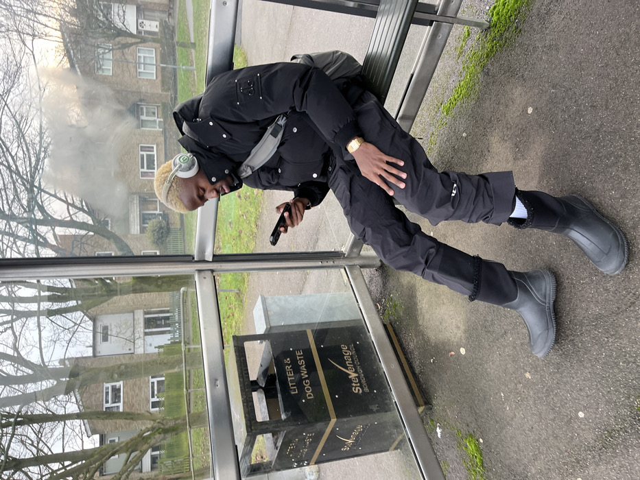 A person sits at a bus stop, legs stretched out, wearing black pants, a black puffer jacket, and black rain boots