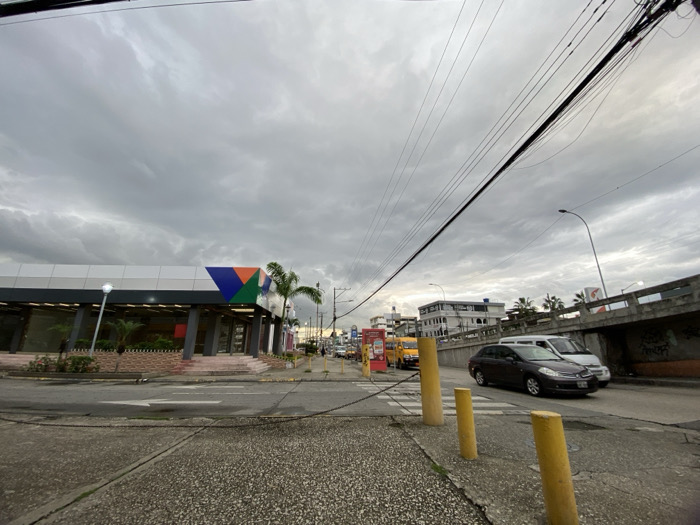 A cloudy street view features a large building with a colorful, triangular design element above its entrance. Utility poles and wires crisscross the sky. Vehicles, including a dark car and a white van, are visible on the road beside a bridge. Yellow bollards line the curb near a crosswalk. The overall atmosphere is overcast and urban.