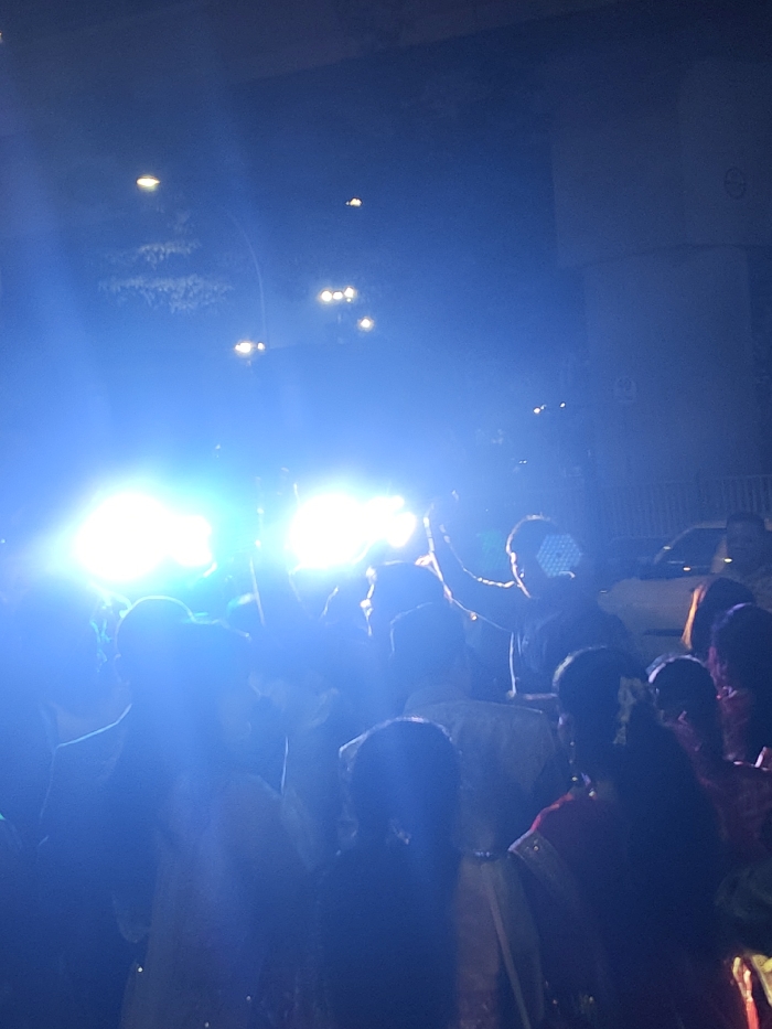 A group of people is gathered outdoors at night, illuminated by two bright lights. Some individuals are silhouetted against the light, while others are visible in more detail. The environment includes streetlights in the background and the edge of a structure on the right side of the frame. A car can be seen behind the crowd. The overall scene seems to capture an event or performance taking place.