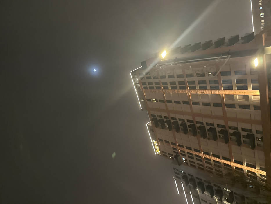 A low-angle shot captures a tall building at night. The structure is illuminated with bright lights along its edges, and spotlights at the top. Rows of dark, possibly air conditioning units, line the building's facade. The sky is dark and foggy, with a faint moon visible in the distance. The image is slightly tilted, enhancing the building's height.