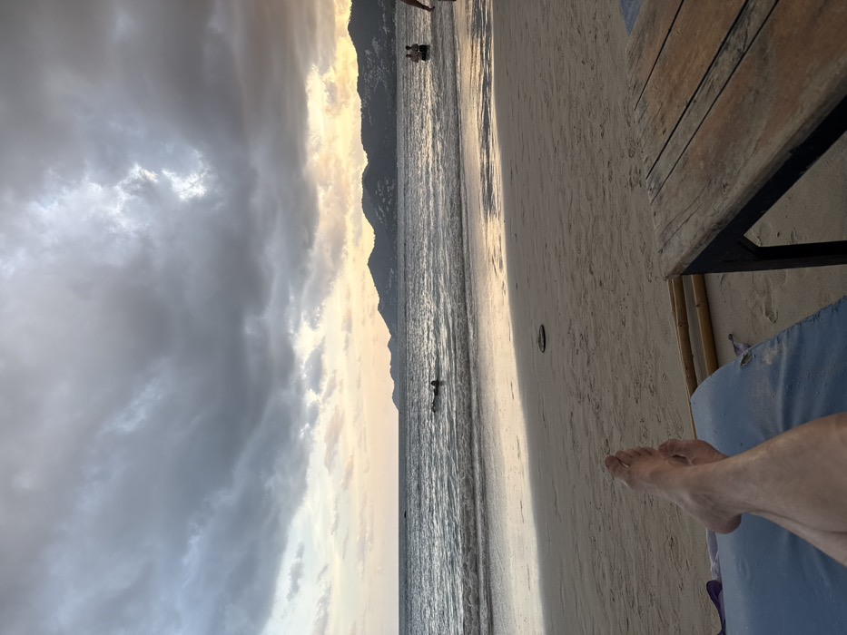The scene depicts a beachfront view at Baan Chaweng, Thailand, during dusk or sunset under an overcast sky. The camera's perspective is low, originating from an individual reclining on a blue beach cushion, with their bare legs and feet visible in the lower left foreground, crossed at the ankles. To the right of the recliner, a segment of a rustic wooden table with dark legs and a light brown slatted surface is visible. The sky occupies the upper two-thirds of the image, dominated by heavy, dark grey clouds. A narrow band of orange and yellow light from the setting sun is visible along the horizon, just above the distant ocean. A range of dark, undulating hills or mountains with faint signs of development runs along the far horizon line. The ocean exhibits moderate waves breaking onto a sandy beach. The wet sand near the waterline reflects the ambient light. In the mid-ground, a dark, circular object rests on the dry sand. Several individuals are present in the water: one person is seen floating or swimming on their stomach further offshore in the left-center, while two other individuals are standing waist-deep in the shallow water towards the right-center, their backs partially visible. The lower portion of a person's leg and foot is visible on the far right edge of the frame, indicating another individual walking out of view.