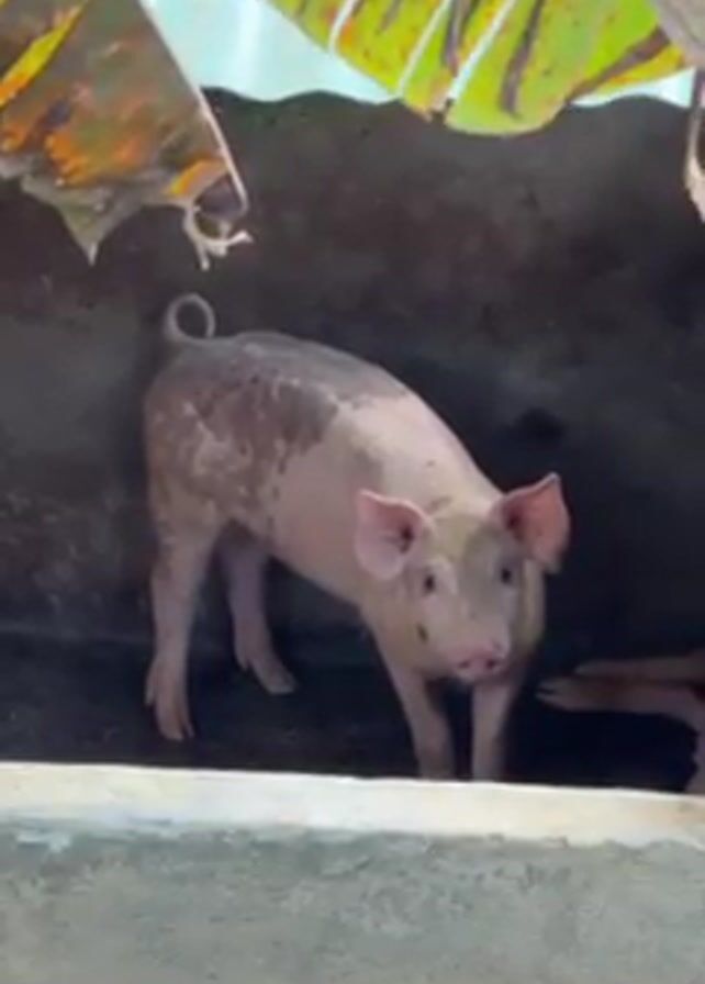 A pig stands in an enclosure. The pig is light pink with some darker spots and a curled tail. The enclosure is partly shadowed. A banana leaf provides some coverage at the top. A low concrete wall is in the foreground.