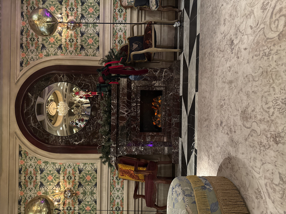 A decorated fireplace is flanked by chairs, above is an oval mirror reflects the chandelier in the next room. The fireplace is decorated with a nutcracker and garland. The walls are covered in patterned wallpaper. A checkered floor and a patterned rug frame the scene. A golden orb hangs from the ceiling, reflecting light throughout the room.