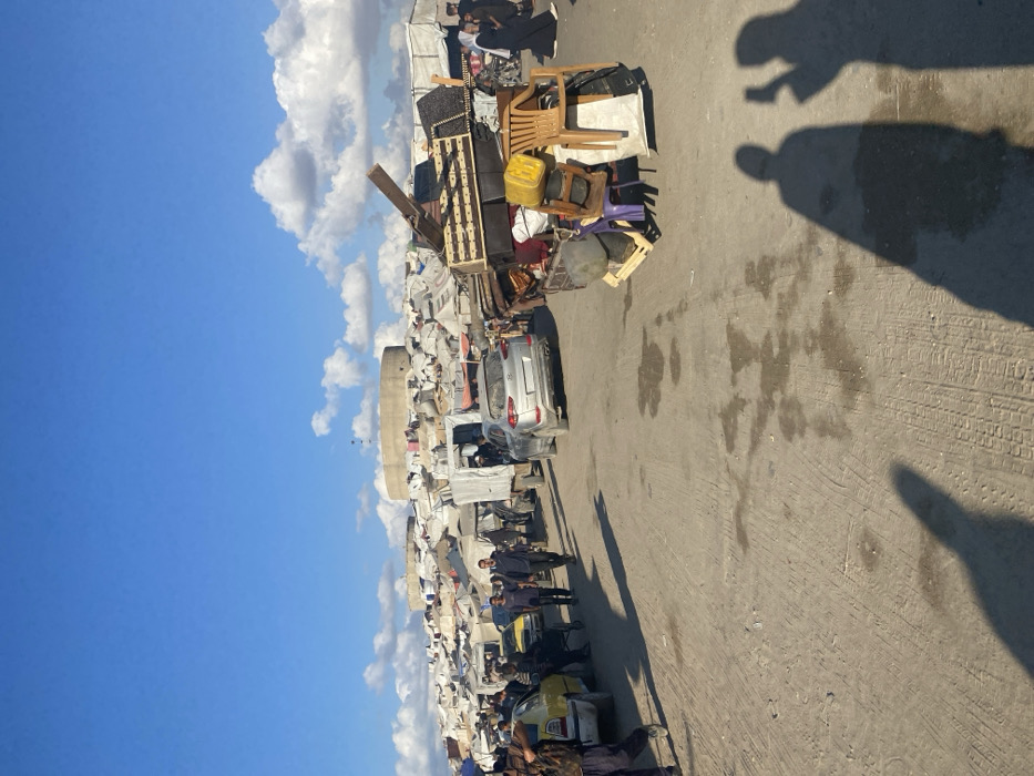 The image depicts a crowded outdoor scene in al-Qarara, Palestinian Territory, under a clear blue sky with scattered white clouds. The foreground features an unpaved, light-colored dirt road with tire tracks and dark wet patches. Long shadows of three individuals, including one holding a smartphone, are cast across the lower right portion of the road, indicating the presence of the photographer and others. In the midground, numerous people are visible walking along the road. Several vehicles are present: a yellow sedan is parked or moving slowly on the left, and a silver SUV (resembling a Hyundai Tucson) is in the mid-right, followed by a white truck with a covered bed. To the immediate right, a substantial pile of assorted household items is visible, loaded onto what appears to be a cart or small vehicle. This pile includes wooden furniture pieces, multiple plastic chairs (brown, purple), a yellow plastic jerrycan, and various bags and coverings. The background is dominated by a densely packed settlement of makeshift shelters or tents, stretching across a rise or hillside. These structures are predominantly white and light-colored, constructed from tarpaulins, fabric sheets, and possibly other salvaged materials. Two large, circular, concrete or stone structures, possibly water tanks or reservoirs, are prominently situated atop the highest point of the settlement in the distance. The overall scene suggests a temporary or displaced living environment with significant human activity.