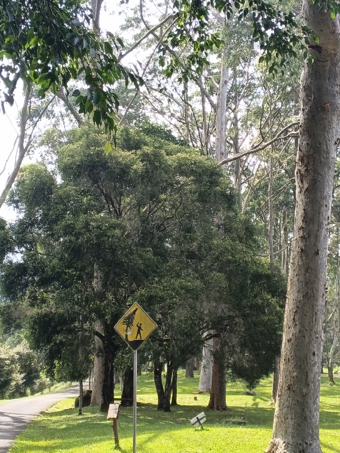 A forested area features a paved road alongside a grassy expanse with scattered benches. Towering trees, some with distinctive smooth gray bark, fill the background. A yellow warning sign displaying a falling tree and a person is prominently positioned amidst the trees. Overhanging foliage adds depth to the scene, creating dappled light patterns.