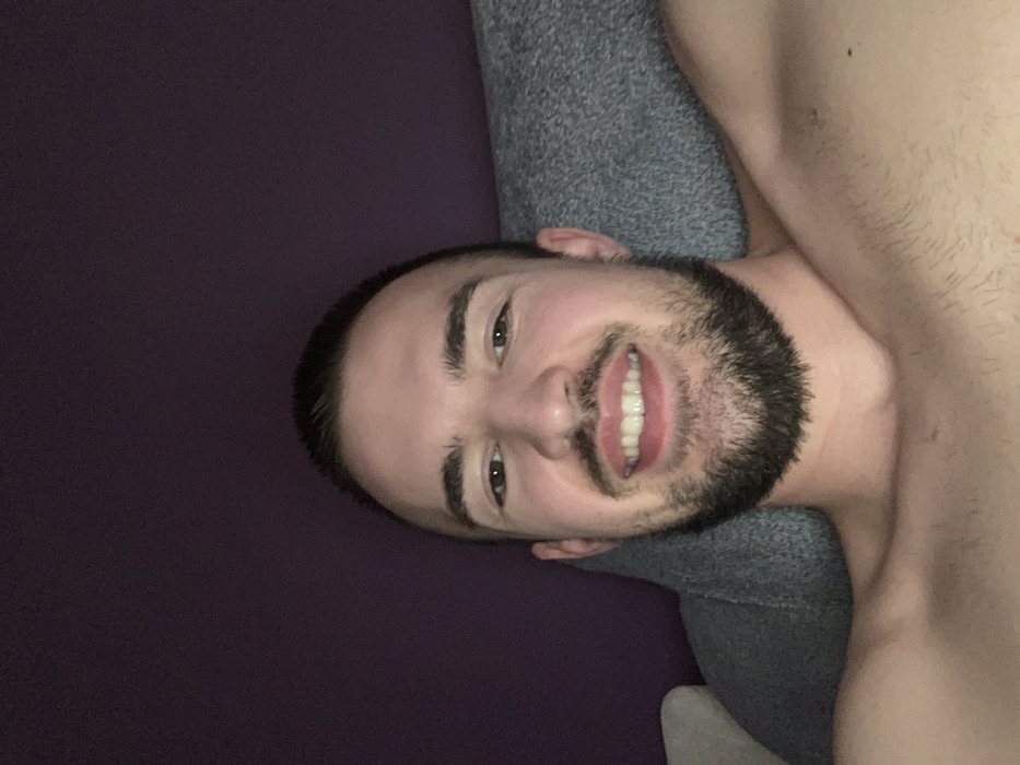A close-up, front-facing image depicts an adult male from the chest up, positioned indoors. The subject has short dark hair, a light complexion, and a dark, trimmed beard and mustache. He is smiling, revealing his upper and lower teeth. His dark eyes are open, and his eyebrows are dark. The subject appears bare-chested, with his shoulders and upper chest visible. Behind the subject, a solid dark purple wall occupies the upper portion of the background. A textured gray fabric object, likely a pillow or cushion, is partially visible behind the subject's head and shoulders, extending to the lower right and left of the frame. The lighting is soft and appears to be artificial. The specific location in the city of Sofia, Bulgaria, cannot be determined from the visual content of the image.