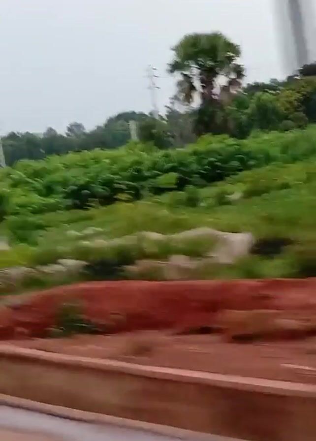 view from a moving vehicle on a road with red soil on the side. On the other side of the road, there is a patch of green vegetation with some trees. People are walking along the side of the road. The sky is overcast. A billboard structure is briefly visible at the beginning of the video.
