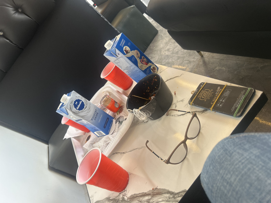 The scene is set indoors in Gura Top, Nigeria, featuring a marble-patterned white table as the primary focal point. In the lower left foreground, a partial view of a person's knee, clad in light blue denim jeans, is visible. The table is laden with items suggesting recent consumption: three red plastic cups (two upright and empty, one partially visible), and a white rectangular tray holding a crumpled napkin with dark stains and a small clear container of toothpicks with a red lid. Two blue and white 1-liter cartons of "Hollandia Yoghurt Drink" ("Sweetened" and "Journey") stand upright on the table. Adjacent to these are a black plastic bowl, appearing partially damaged at the rim, containing dark food remnants and a wooden skewer. A pair of brown-framed eyeglasses with clear lenses rests near the bowl. Further right, a dark-colored smartphone is present, secured with three yellow rubber bands and displaying a "CROWN CG" logo; a small key or charm is attached to its top. The background reveals dark, upholstered seating (possibly sofas or benches) with button-tufting, and a grey tiled floor, indicating an indoor commercial or lounge environment. The arrangement suggests the aftermath of a casual gathering or meal.