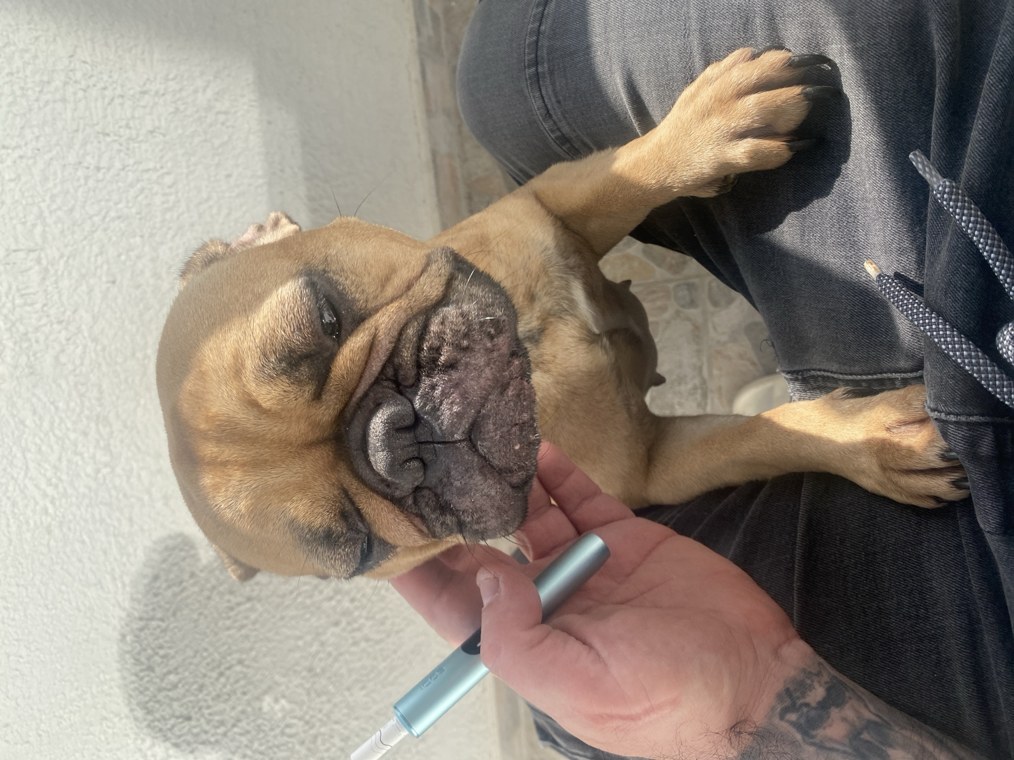tan French bulldog lying on the lap of a person wearing grey jeans. The bulldog is facing the camera with its eyes partially closed. The person is holding a light blue, pen-like device in their hand. The location appears to be outdoors with a white wall in the background. The environment provides no further clues to its precise location in Sofia, Bulgaria. The man has visible tattoos on his right arm.