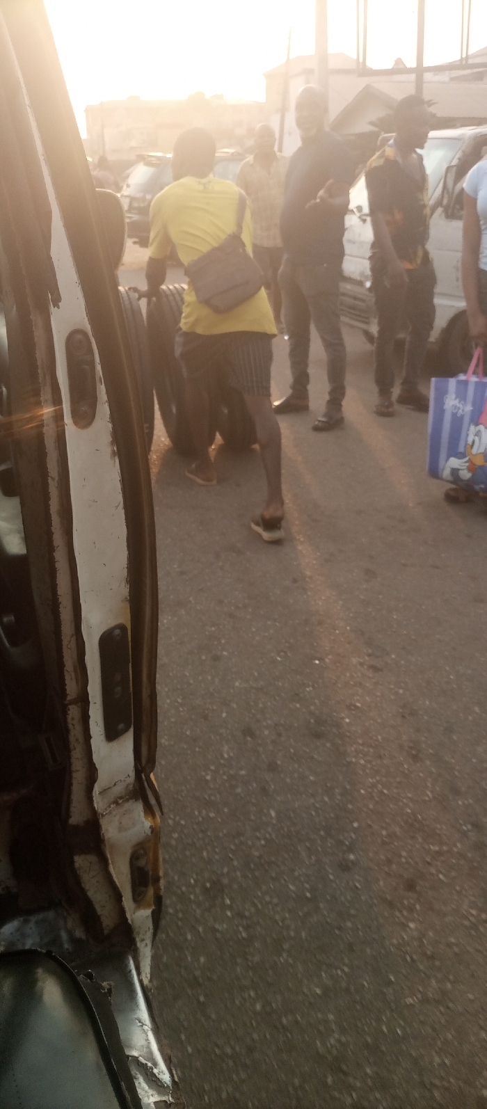 The image displays an outdoor scene on an asphalt road in Ogbunike, Nigeria, during daylight hours characterized by strong, hazy sunlight. In the immediate foreground on the left, the inner panel and jamb of a white vehicle door, showing signs of wear and rust, are partially visible. The midground features a male subject in a yellow short-sleeved shirt and striped shorts, positioned centrally and facing away from the camera. He is bent over, actively engaged with two large black tires resting on the pavement. He wears a dark shoulder bag and mismatched footwear. To his immediate right, another male subject in a dark shirt and pants stands, facing towards the right with his left arm raised in a gestural manner. Further right, a third male subject in a patterned dark shirt is visible standing near the front of a white van. On the far right edge of the frame, a female subject is partially visible, holding a blue shopping bag adorned with a cartoon character. Additional vehicles, primarily light-colored vans, and indistinct human figures are present in the background. The overall scene suggests a roadside activity involving vehicle tires.
