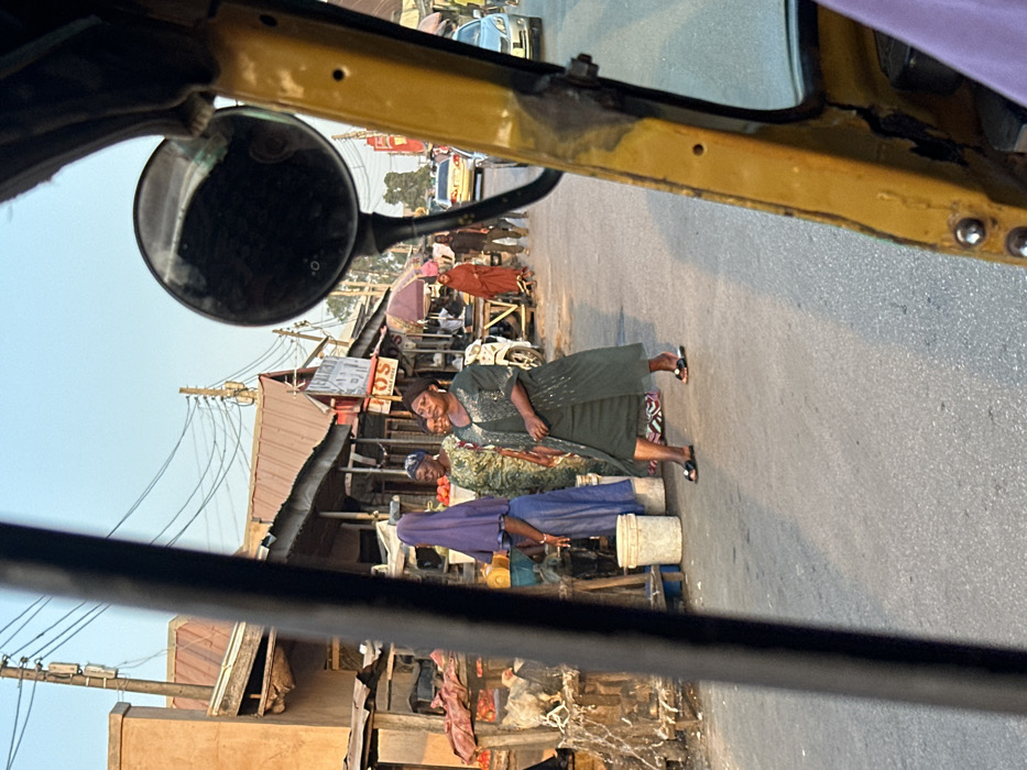 A street scene is captured from the inside of a vehicle. Two women are walking along the side of the road. Shops and vendors line the street, adding to the vibrancy. The vehicle's mirror reflects a glimpse of the bustling surroundings. The image provides an immersive view of the lively street scene.