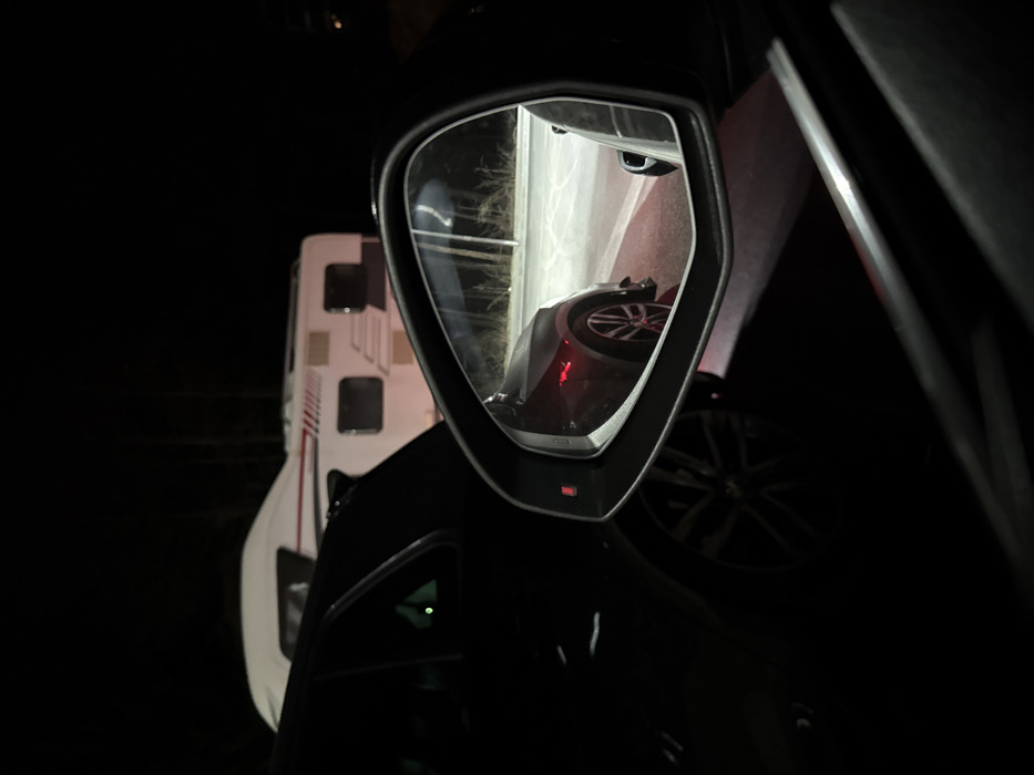 The image presents a nighttime scene in Bansko, Bulgaria, captured from within a dark-colored vehicle, looking towards its passenger side. In the immediate foreground, the lower right portion shows the interior door frame of the observer's vehicle, largely in shadow. A dark, possibly black, exterior side-view mirror of the observer's vehicle occupies the mid-right, displaying a distinct red indicator light on its housing. Outside the observer's vehicle, to the left of the side mirror, a dark-colored SUV or similar vehicle is stationary. Its rear quarter panel, a rear wheel with multi-spoke dark alloy rims, and a small section of its rear window are discernible. The side-view mirror reflects a portion of another dark-colored vehicle, possibly a hatchback or sedan, positioned to the right of the observer's vehicle. This reflected vehicle shows its front wheel with multi-spoke alloy rims, a section of its fender, and illuminated red taillights. It appears to be on a paved surface marked with a white line, with sparse dry vegetation and a vertical post or light pole visible in the reflection beyond the road surface. In the background, behind the SUV and the reflected vehicle, a large, white travel trailer or caravan is stationary. It features multiple rectangular windows, dark grey or black accents, and red and grey stripe decals along its side. The uppermost background is predominantly dark, indicating night, with faint silhouettes suggesting trees or dense foliage. No people are visible.
