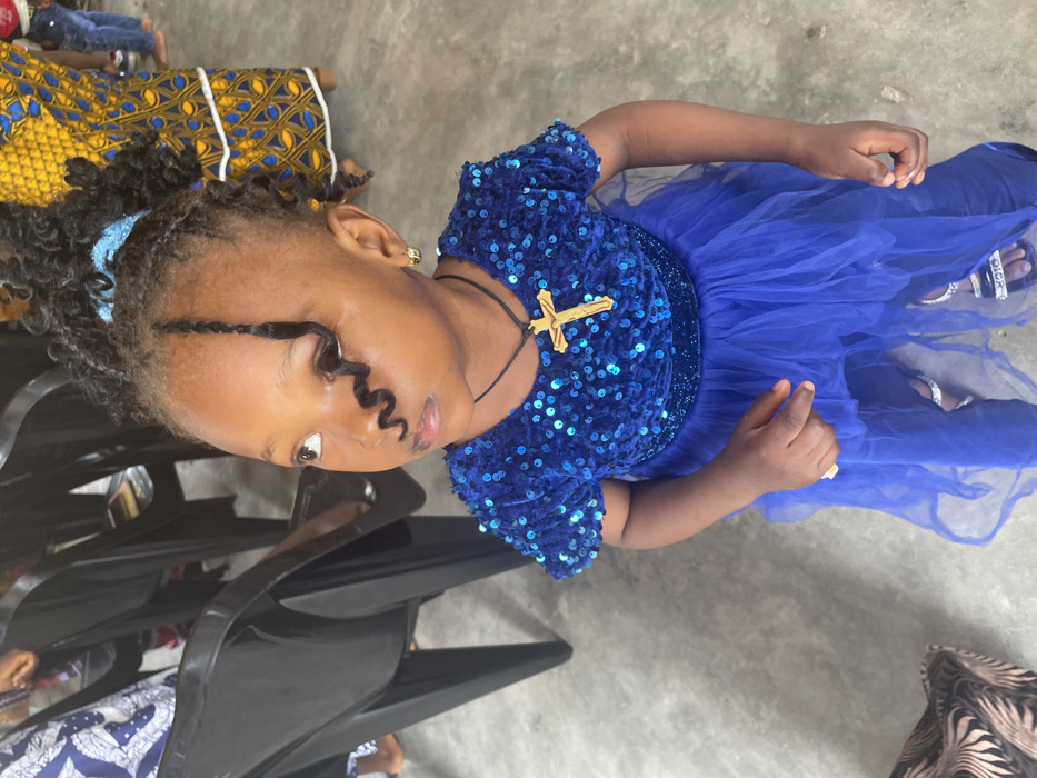A young girl in a sparkling blue dress and a wooden cross necklace looks up. Her hair is styled with a curled lock near her face and a blue hair tie. She stands indoors on a gray floor, surrounded by black chairs. Hints of patterned fabrics and other people are visible in the background. The image is taken from above, highlighting the girl's outfit and expression.