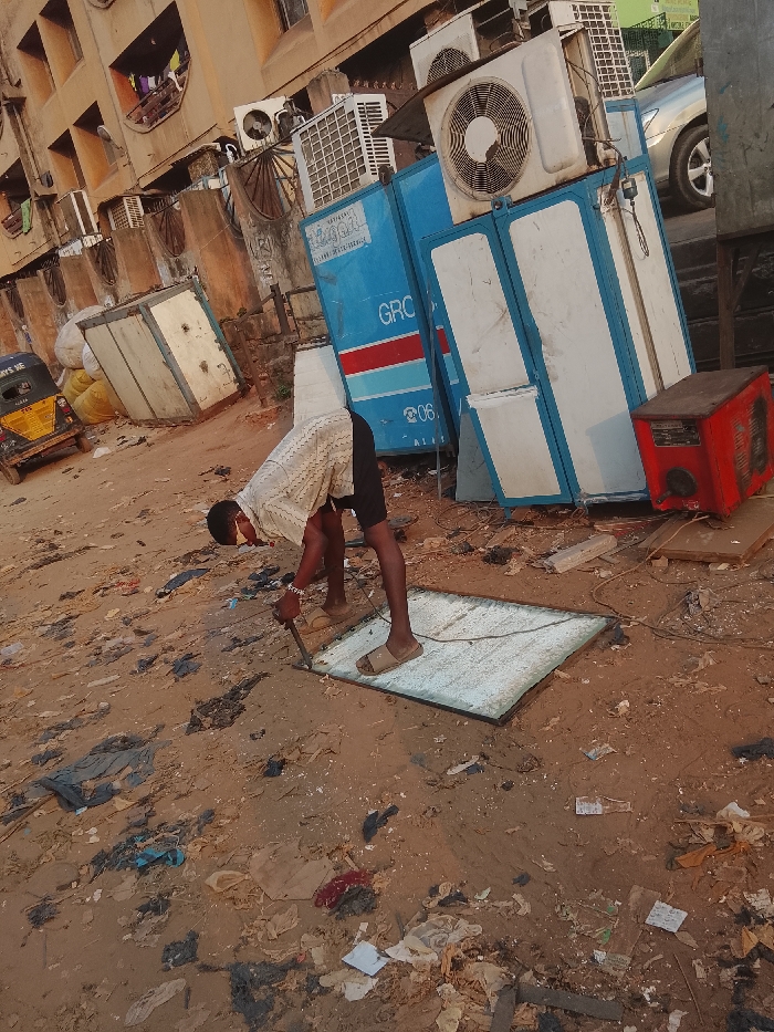 In an outdoor setting, a person wearing a light patterned shirt and dark shorts bends over a large, rectangular object on the ground. They are using a tool, possibly a chisel or small pry bar. The surrounding area appears cluttered with debris. In the background are several large, light-colored units, possibly refrigeration or air conditioning units, stacked or positioned near a building with numerous windows. A small vehicle is visible in the distance.