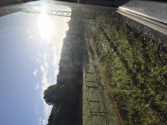 The image presents an outdoor landscape observed through a window, consistent with a view from a moving vehicle in Jouy-en-Josas, France. The scene is characterized by a low-angle sun, suggesting either early morning or late afternoon. The sky in the upper portion is clear blue with scattered white cumulus clouds. A bright, intense sun, positioned in the upper right quadrant, generates significant glare and lens flare, partially obscuring the view on the right side and creating reflections on the window. In the background, a dark green, densely wooded hillside ascends from left to right, with a faint, low-lying atmospheric haze or mist visible near its base. The mid-ground comprises a verdant field, appearing damp with dew. A series of dark, thin fence posts are visible, irregularly spaced within this field. A thin, reddish-orange horizontal line, resembling a wire or string, stretches across the mid-left field. The foreground is dominated by lush, dewy green grass and various weeds, brightly illuminated by the sun. Immediately adjacent to the window frame on the right, a dark strip of ground, possibly gravel or dirt, runs parallel to the observer's path. A dark, vertical window frame occupies the extreme right edge of the image. Through the window, partially silhouetted against the bright sunlight and obscured by glare, a dark metal lattice structure, consistent with a power transmission tower, is visible in the upper right. No human figures or direct human actions are depicted.