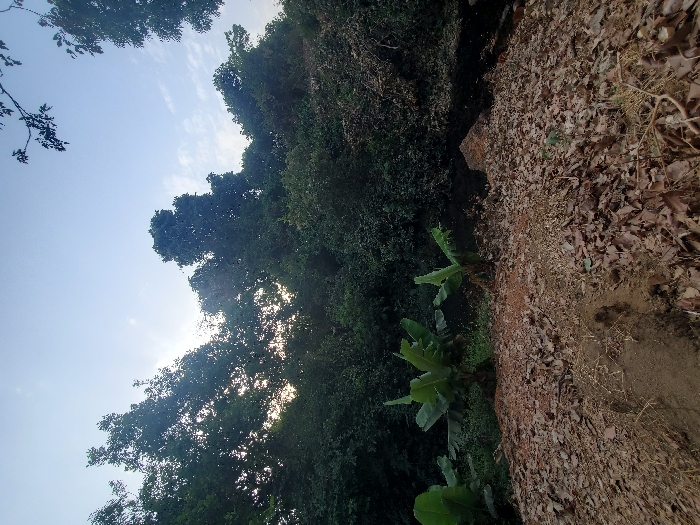 The scene, located in Mangu, Nigeria, depicts an outdoor natural environment under a light blue sky with scattered faint clouds. The upper two-thirds of the image show a dense canopy of dark green trees, through which bright sunlight is visible. In the midground, towards the left, three banana plants with large green leaves are present. To their right, a dark, narrow gully or water channel runs through the terrain, containing dark material consistent with soil or stagnant water, alongside a small, lighter-colored rock or debris. The foreground consists of reddish-brown soil heavily covered by a thick layer of dry, fallen brown leaves and sparse dry vegetation. A distinct, partially formed impression, consistent with a footprint, is visible in disturbed soil in the lower-left quadrant. No human individuals or discernible activity are depicted.