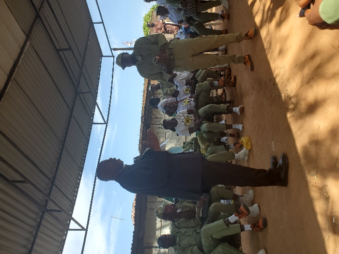 The image displays an outdoor gathering under a light-colored corrugated metal canopy, located in Jos, Nigeria. The ground is dry, reddish-brown earth. In the foreground, two dark-skinned men stand opposite each other. The man on the left, bald and wearing a dark suit, has his hands raised, possibly gesturing while speaking. The man on the right, dressed in a light olive-green uniform, including a cap, and light brown shoes, holds a small, reddish-brown pottery vessel in his left hand, with his right hand slightly raised. Behind these two individuals, approximately 10-15 dark-skinned individuals are seated on chairs and benches, facing the foreground speakers. Many are wearing similar olive-green uniforms with caps, consistent with the Nigerian Youth Service Corps (NYSC) attire, while others wear white t-shirts with partial lettering and dark trousers. They appear to be an attentive audience. The background reveals low-rise structures with corrugated metal roofs and a bright blue sky with scattered clouds.