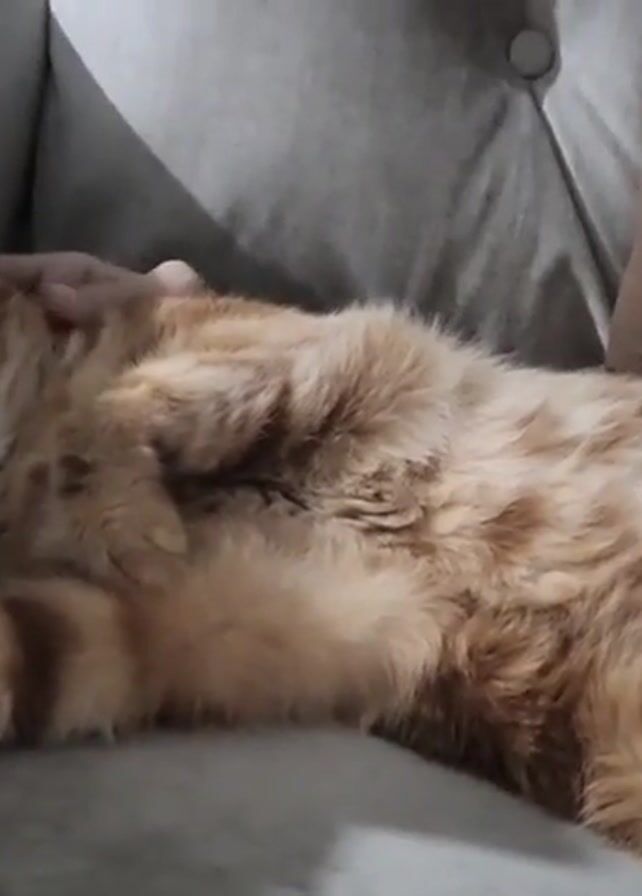 A ginger cat is sleeping on a gray sofa. It is lying on its back, with its paws curled up near its face. A person in a brown shirt is sitting next to the cat on the sofa.