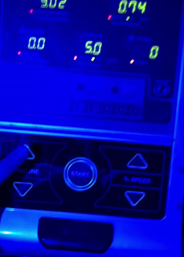 close-up of the control panel of a treadmill. The panel displays information such as time (9:05), distance (0.74), incline (7.0), speed (5.0) and pulse (0). A finger is seen pressing the "INCLINE" up arrow button, increasing the incline setting. The panel is lit with a bright blue light, creating a cool, technological feel.