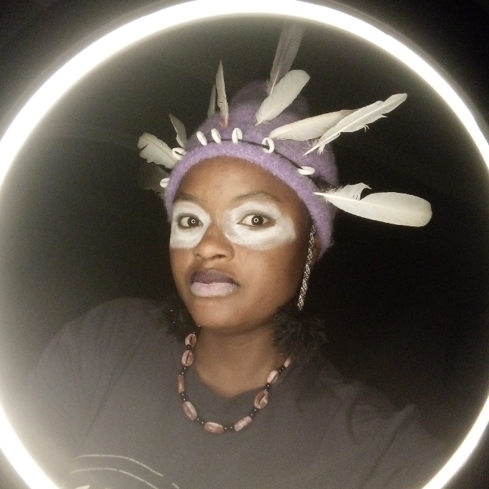 A person stands centered in a circular light. The person wears a purple knit hat adorned with feathers and shells. White makeup encircles their eyes. They have a solemn expression with muted purple lips. The person wears a necklace of light-colored, oblong beads interspersed with black beads and large, fuzzy, dark earrings. They wear a dark-colored shirt. The background is black.