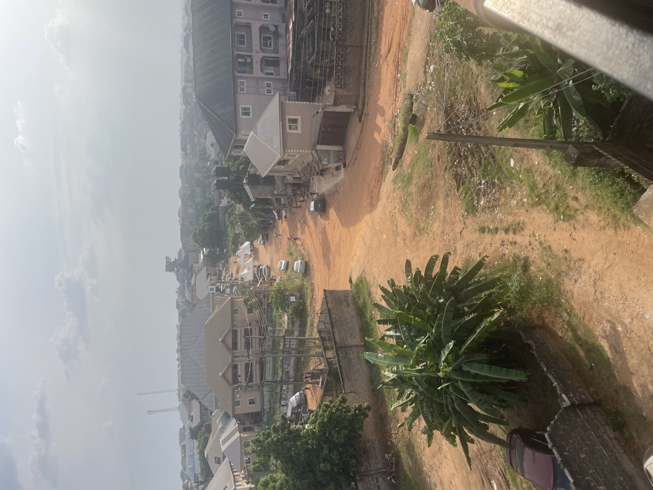 This elevated view depicts a residential area within Akpaka Forest Reser, Nigeria, under bright, partly cloudy daylight