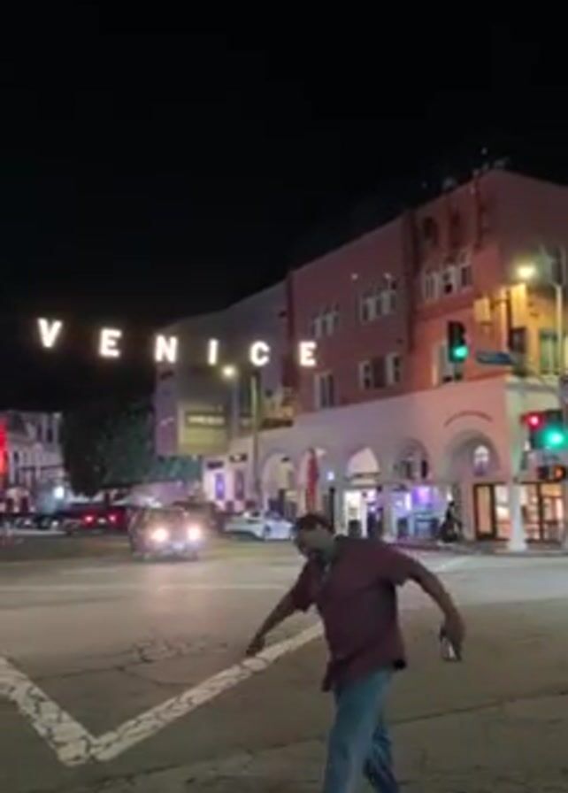 At night, the Venice sign illuminates a street corner as cars pass by. A man crosses the crosswalk, gesturing with his right hand and holding something in his left. He wears a dark shirt, jeans, and dark shoes. Buildings flank the street, their facades visible in the night. The traffic light is green. The street is cracked and marked with painted crosswalk lines.