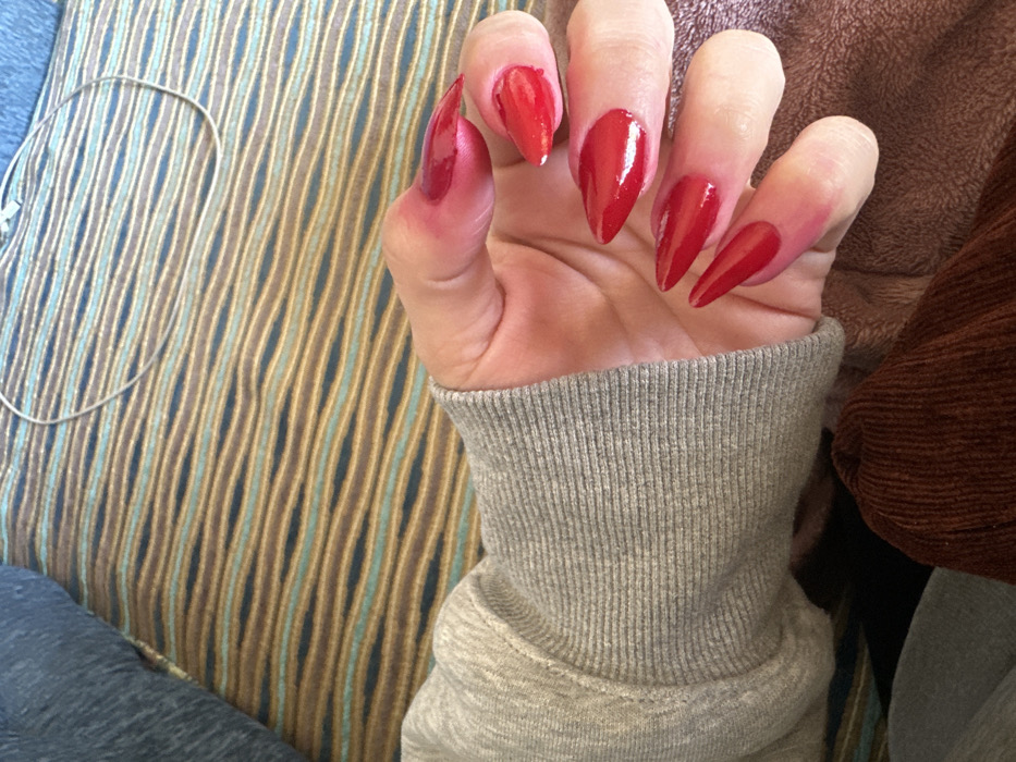 Location: Unknown, Unknown. The image depicts a close-up, downward-angled view of a human left hand. The hand is positioned centrally, extending from the bottom edge upwards. Five fingers are visible, each bearing a long, stiletto-shaped artificial nail coated in a glossy, bright red polish. Red polish residue is evident on the skin surrounding the cuticles of the thumb, index finger, and pinky finger. The wrist is encased in the ribbed cuff of a grey, long-sleeved garment. Below the hand, a section of a brown, corduroy-like fabric is present. The background consists of a textile surface patterned with horizontal, wavy stripes in varying shades of brown, tan, and light blue. A section of solid blue fabric is visible in the upper left quadrant. A thin, white cable, possibly a charger or headphone wire, is loosely coiled on the patterned background in the upper central area. No other individuals are present.