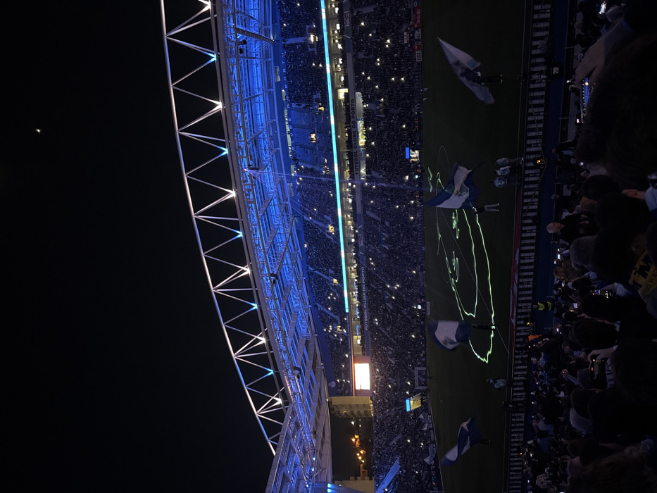 A nighttime view of a packed soccer stadium. The stadium's structure is illuminated with blue and white lights, contrasting with the dark sky. The field is visible, with apparent patterns or designs lit up on it. Fans fill the stands, many holding up phones or lights. Flags are being waved. The overall atmosphere is vibrant and energetic.