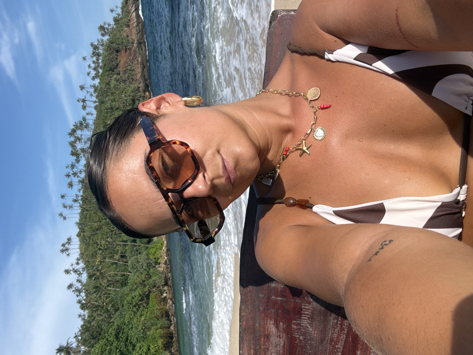 A medium close-up, eye-level selfie depicts a woman seated on a wooden surface, facing the camera at a beach in Mirissa, Sri Lanka. Her dark hair is slicked back. She wears large, tortoise-shell patterned sunglasses with brown lenses, a gold-colored hoop earring on her right ear, and a gold-colored chain necklace adorned with multiple charms, including a starfish, a white heart, a circular coin-like pendant, and two red chili-shaped pendants. Her skin appears tanned. She is wearing a brown and white striped bikini top with a beaded strap on her left shoulder. A small dark tattoo is visible on her left upper arm, and a faint scratch mark is present on her right upper chest. The background reveals a tropical beach scene under a clear blue sky with minimal clouds. The ocean with gentle white-capped waves is visible directly behind her, leading to a lush, green headland or small island densely covered with numerous tall palm trees and other tropical foliage. The wooden surface behind her appears to be the backrest of a beach chair or bench. Natural bright sunlight illuminates the scene.